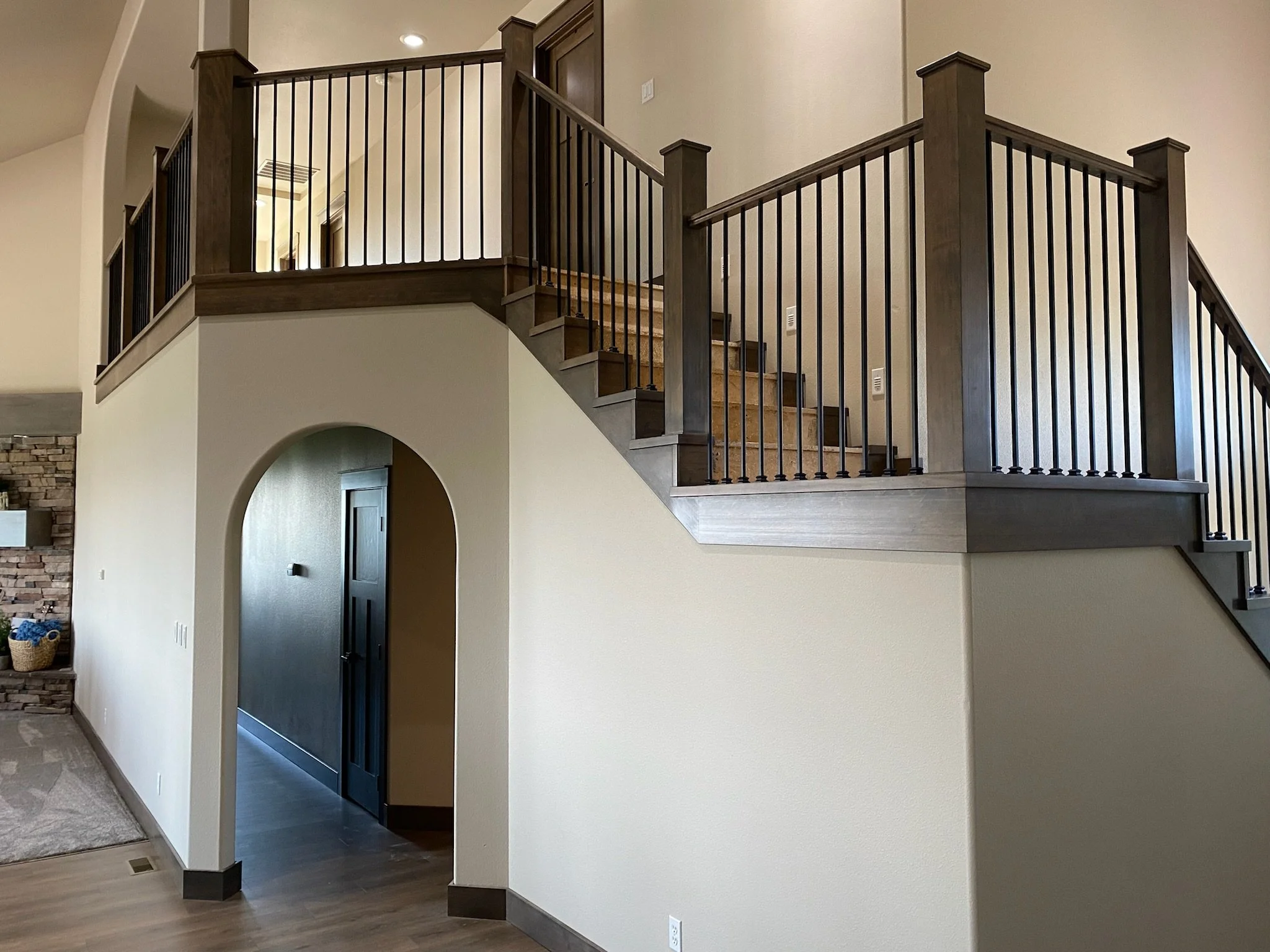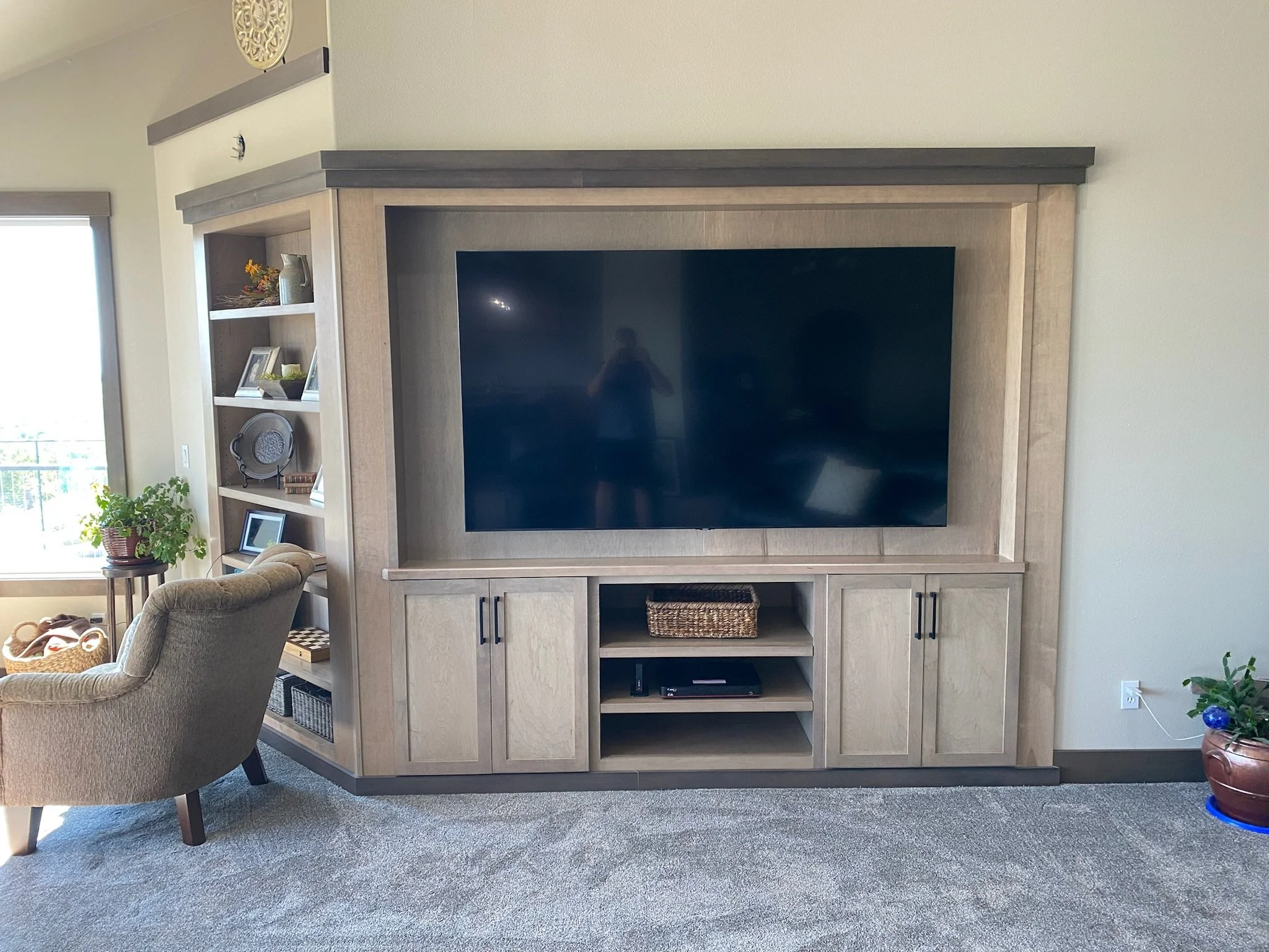 Entertainment center, mitered beam wrap, box mantles & balustrade